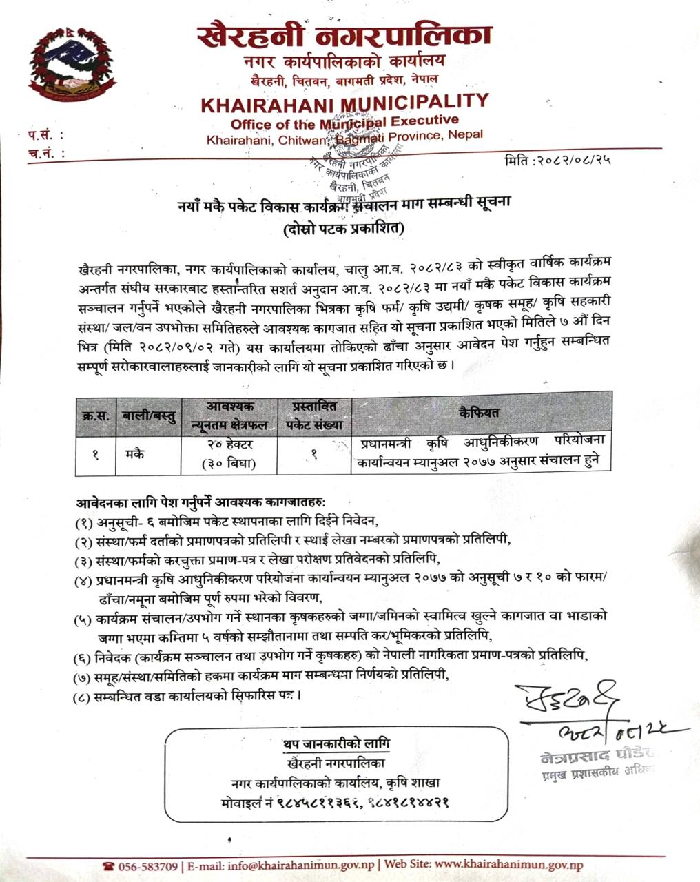 नयाँ मकै पकेट विकास कार्यक्रम सम्बन्धी दोस्रो पटक प्रकाशित सूचना ।।