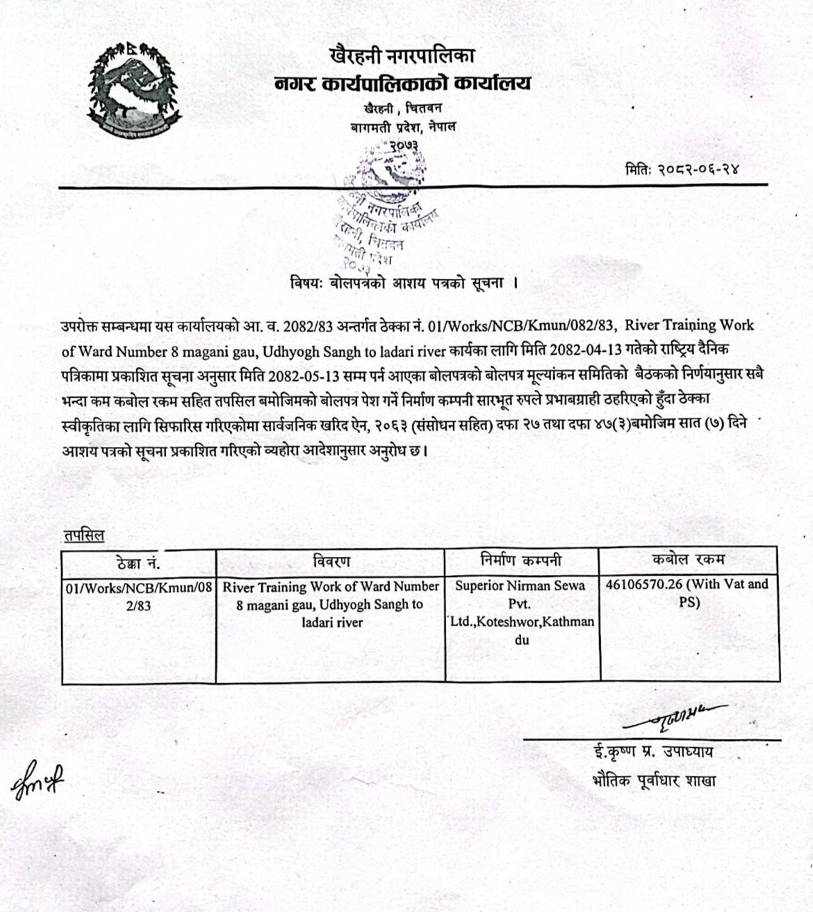 बोलपत्र(03/SQ/Goods/KhairahaniMun/2082/83)को आशय पत्रको सूचना ।