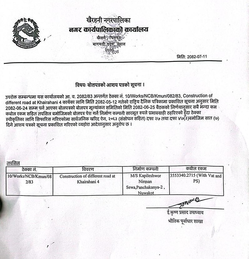 बोलपत्र(10/Works/NCB/Kmun/082/83)को आशय पत्रको सूचना ।