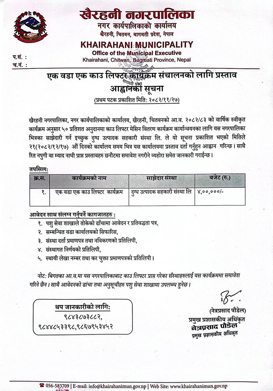 गाईभैंसी तथा हे/साईलेज प्रवर्द्धन कार्यक्रम संचालनको लागि प्रस्ताव आह्वानको सूचना !
