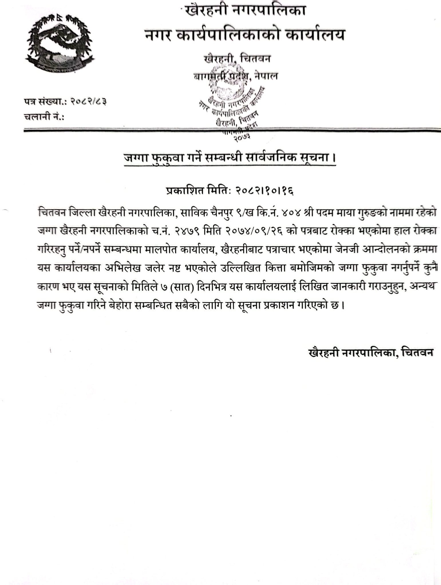 जग्गा फुकुवा गर्ने सम्बन्धी सार्वजनिक सूचना ।